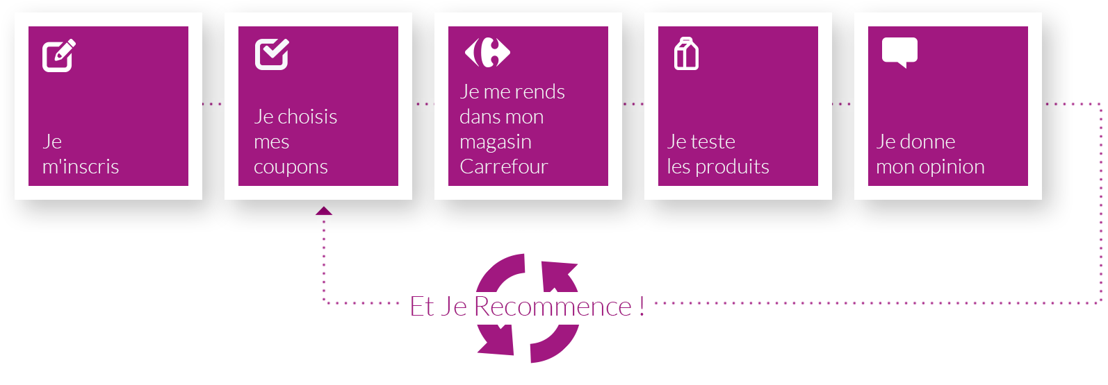 Choisisez les produits que vous voulez tester, en fonction du nombre de points que vous avez, (450 points à votre inscription) et chaque produit correspond à un nombre de point (vous pourrez augmenter ce nombre dans le temps), rendez vous dans votre magasin, trouvez vos produits choisis, passez à la caisse, présenter vos coupons à la caissiére, grâce à votre téléphone ou coupon papier (vos produits seront donc gratuits), pour finir 24h après vous pourrez donner votre avis sur chacun des produits et vous pourrez choisir les prochains que vous souhaitez tester.