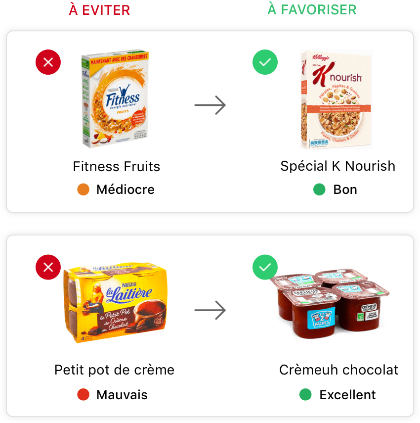Lorsque vous scannez un produit qui a un impact négatif sur la santé, Yuka vous recommande un produit équivalent de meilleure qualité. Ainsi, vous continuez à vous faire plaisir tout en mangeant plus sainement !